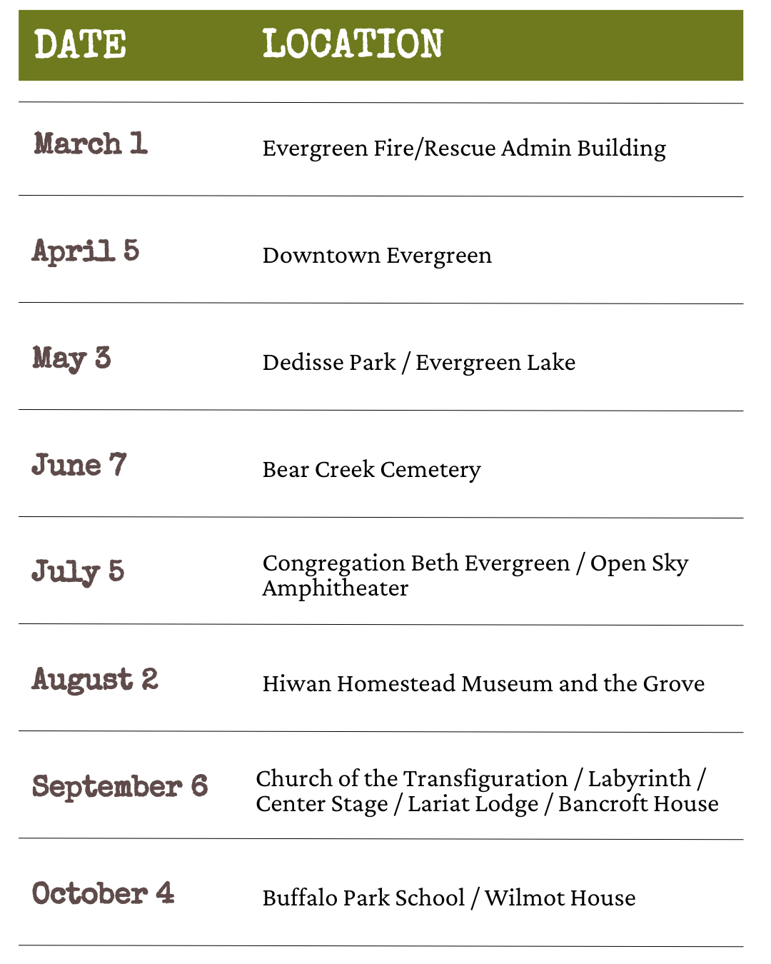 - Evergreen Lake House: Lake House Summer Concerts at main entrance (not available at Buchanan concerts)
