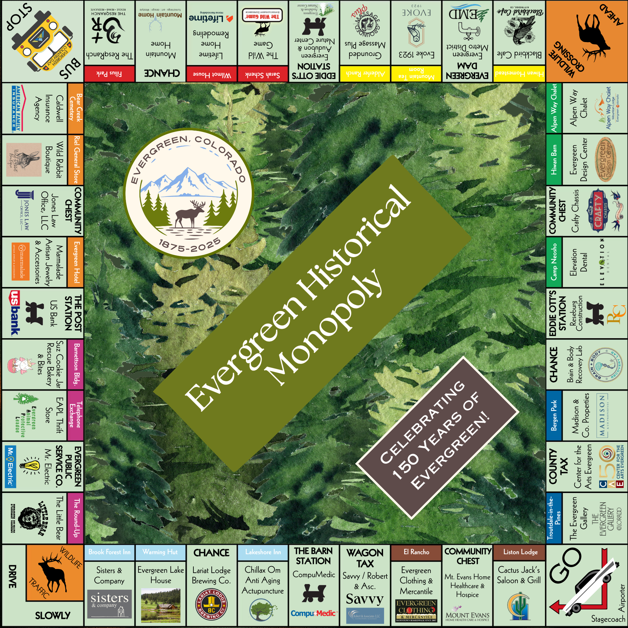 From the beginning of June to the end of August, 38 businesses in Evergreen will be hosting a LIVE and LIFE SIZE Historical Monopoly game! Each participating business will be sponsoring a unique historical location in the community. Visit each site on the map, learn its secrets from local experts, collect its property card, and be the first to win cash prizes for visiting all 38 sites!